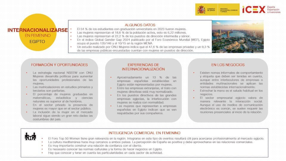 Un 13% de las empresas españolas tienen a una líder en su delegación, que en general se siente muy respaldada por sus compañeros. Además, en el ambiente de negocios se respira un trato muy normalizado con las directivas, sobre todo en empresas extranjeras. El prestigio de nuestro país en Egipto, unido a una potenciación de las interacciones personales con los socios locales, puede garantizar el éxito en las relaciones comerciales.